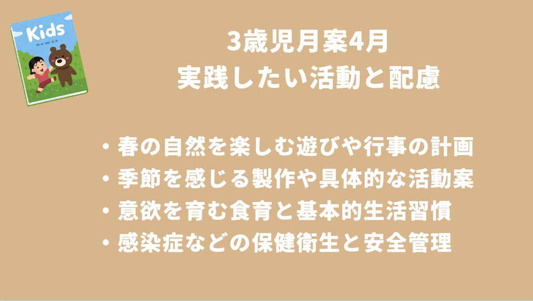 養護の基盤ができつつある中で、教育的な側面(5領域)からのアプローチも徐々に取り入れていきます。4月は以下のような視点を持つと、バランスの良い計画が立てられます。