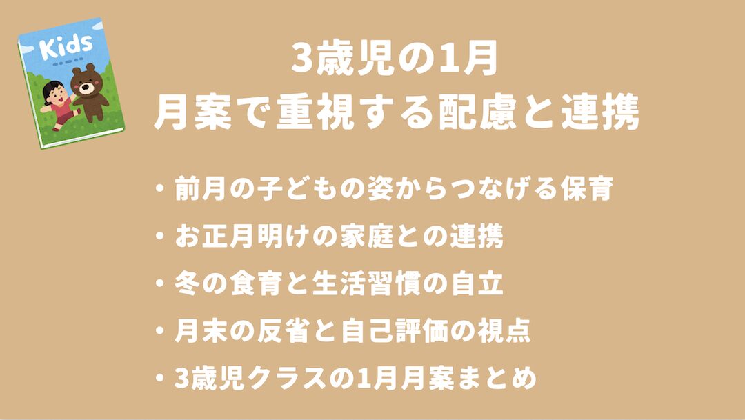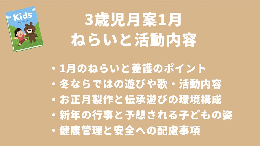 特に1月は「元に戻す」だけでなく、次のステップへ「つなげる」意識を持つことが大切です。食育や生活習慣の自立に向けたアプローチも含め、保護者と共に子どもの成長を支えるための計画を立てていきましょう。